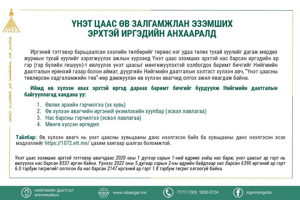 Иргэний тэтгэвэр барьцаалсан зээлийн төлбөрийг төрөөс нэг удаа төлөх тухай хуулийг дагаж мөрдөх журмын тухай хуулийг хэрэгжүүлэх ажлын хүрээнд Үнэт цаас эзэмших эрхтэй нас барсан иргэдийн ар гэр (гэр бүлийн гишүүн)-т өвлүүлэх үнэт цаасыг мөнгөжүүлэхтэй холбогдох баримт бичгийг Нийгмийн даатгалын ерөнхий газар болон аймаг, дүүргийн Нийгмийн даатгалын хэлтэст хүлээн авч нэгтгэн, “Үнэт цаасны төвлөрсөн хадгаламжийн төв”-өөр дамжуулан өв хүлээн авагчид олгох ажил үргэлжилж байна.