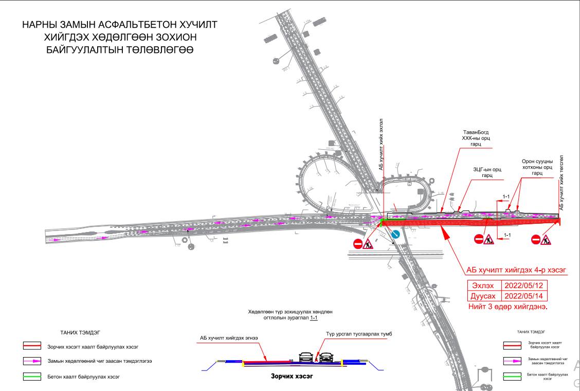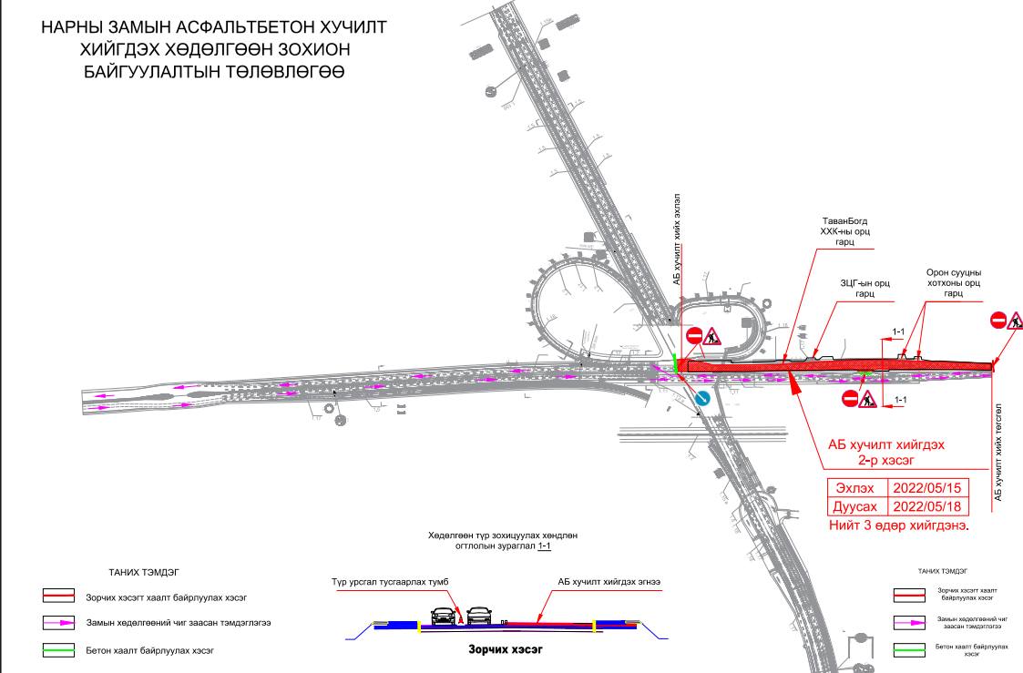 Тодруулбал,Эхний ээлжид Олимпын гүүрнээс Соёолжийн нүхэн гарц хүртэлх баруунаас зүүн чиглэлийн хөдөлгөөнийг 2022 оны тавдугаар сарын 12-ны 00:00 цагаас эхлэн тавдугаар сарын 14-ний 22:00 цаг хүртэл гурав хоногийн хугацаанд,