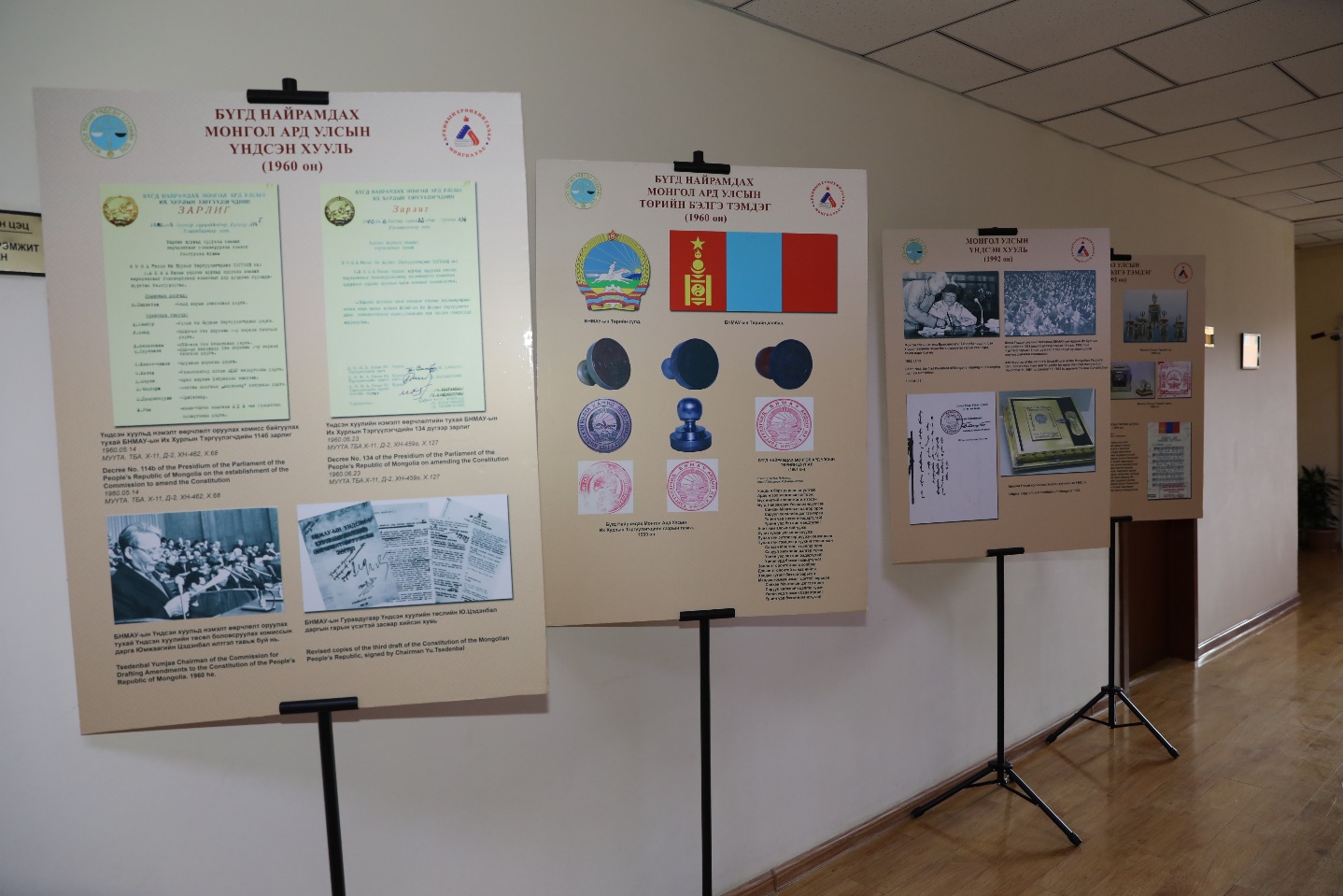 Үзэсгэлэнд мөн Ази тивд дэх анхны Үндсэн хуулийн нэг болох 1924 оны Монгол Улсын Үндсэн хууль болон Богд хаант Монгол Улсын зарим эрх зүйн акт, 1940, 1960, 1992 оны Үндсэн хуулиуд, төрийн сүлд, туг, далбаа, тамга зэрэг тусгаар тогтнол, бүрэн эрхт байдлын бэлгэ тэмдэг бүхий гэрэл зураг бүхий самбарыг дэлгэн тавьсан байна.