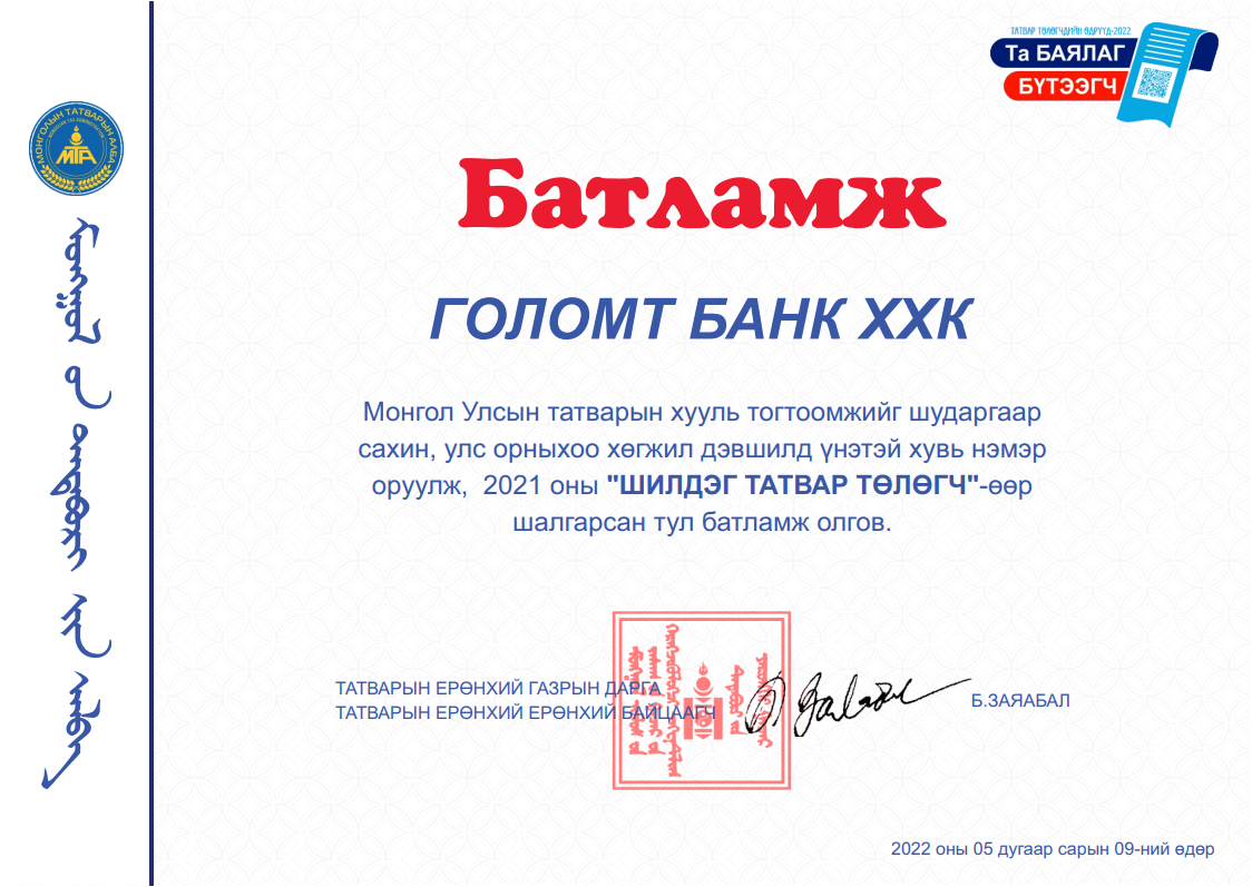 Сайн сайхныг санхүүжүүлэгч Голомт банк үүсгэн байгуулагдсан 27 жилийн хугацаанд үргэлж хариуцлагатай татвар төлөгч байж, Монгол Улсынхаа хууль журмыг чандлан мөрдөж ирсэн билээ. Өнгөрсөн онд ковид-19 цар тахлын нөлөө үргэлжилж, улсын эдийн засаг, банк санхүүгийн салбарын нөхцөл байдал амаргүй байсан ч бид үүссэн нөхцөл байдалд дасан зохицож, шуурхай арга хэмжээ авч ажилласнаар 2021 онд улсдаа 137 тэрбум төгрөгийн татварыг төвлөрүүлэн төлж, ингэснээр сүүлийн гурван жилд нийт 360 гаруй тэрбум төгрөгийн татвар төлөн эдийн засагтаа дэмжлэг үзүүлсэн байна. Улмаар Татварын ерөнхий газраас Голомт банкийг 2021 оны “Шилдэг татвар төлөгч”-өөр шалгаруулж, батламж гардуулж өглөө.