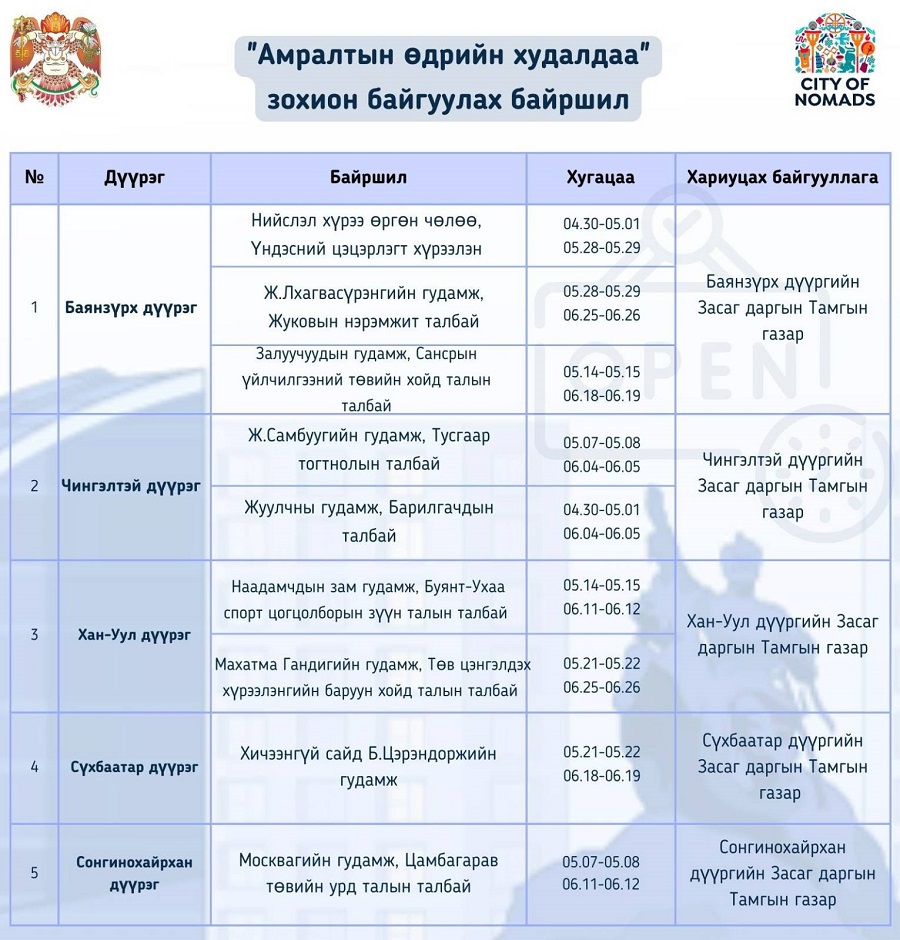 Хуваарийн дагуу дөрөвдүгээр сарын 30, тавдугаар сарын 1-нд Үндэсний цэцэрлэгт хүрээлэнд, тавдугаар сарын 7, 8-нд Тусгаар тогтнолын талбайд худалдаа зохион байгуулсан.