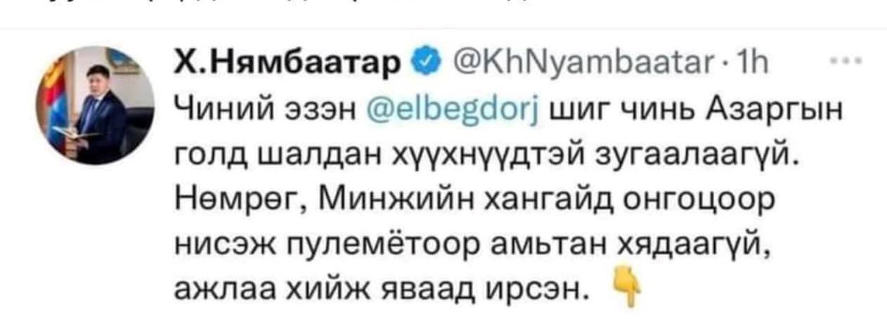 нямбаатар та өөрийгээ ерөнхийлэгч асан Элбэгдоржтой зүйрлүүлэх нь арай сэрүүн зүүд биш биз дээ. Наад хүн чинь улс төрийн туршлага, боловсрол мэдлэг, олон улсын нэр хүндийн хувьд Монголдоо нэг хоёрт орох хүн. Та бол Оюун эрдэнэ, Батзандан, Аюурсайхан нартйа хамт жагсаж гарс ирсэн луйварчдын нэг. та Сонгинохайрхан дүүрэгт барилга байшин өөр юу билээ хулгайд гаршсан луйварчин. Та боловсролгүй хүн. та Оюунэрдэнэтэй ах дүү яагаад ч төрд хамт ажиллахааргүй хүн. Та одоо дуугүй байсан нь өлзийтэй. Та боловсролоо дээшлүүл. Та хуйвалдаан, луйвар хулгайгаа багасга. Хөх инээд хүргэх юм бүү ярь.