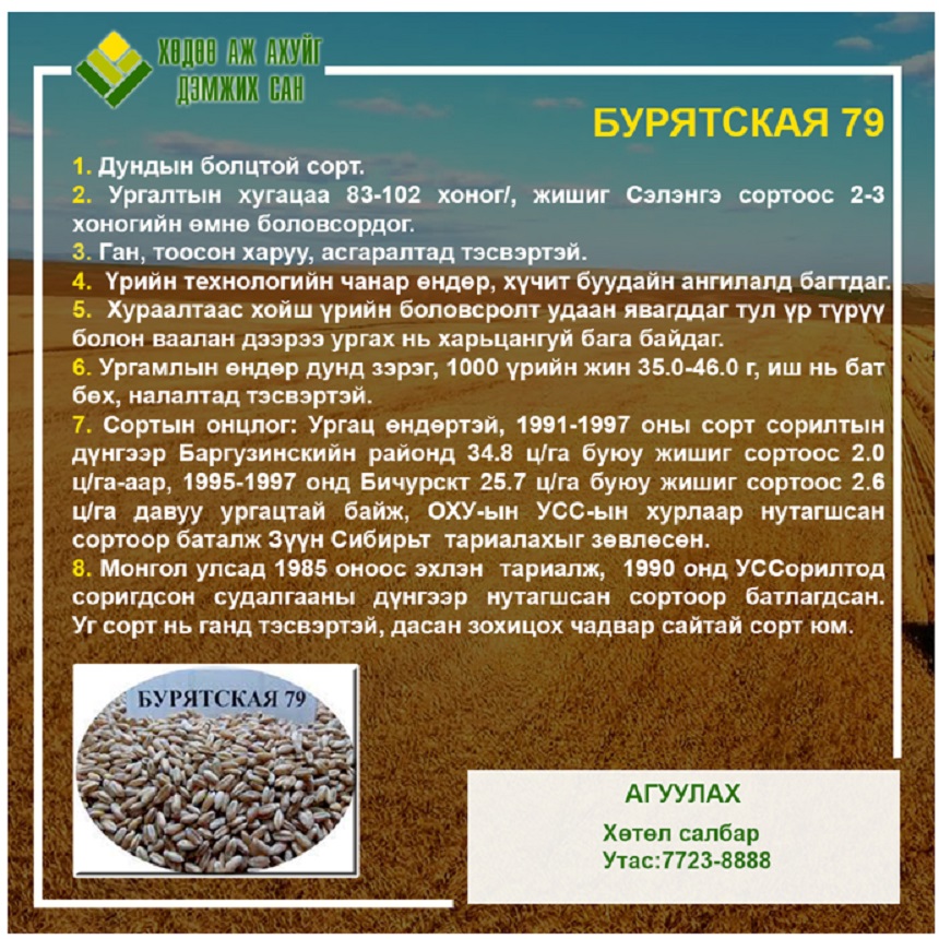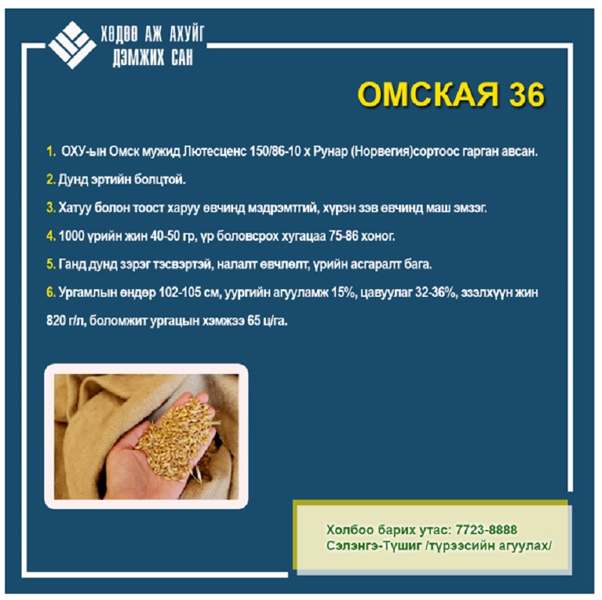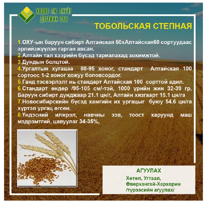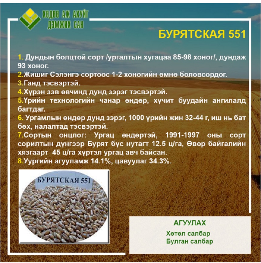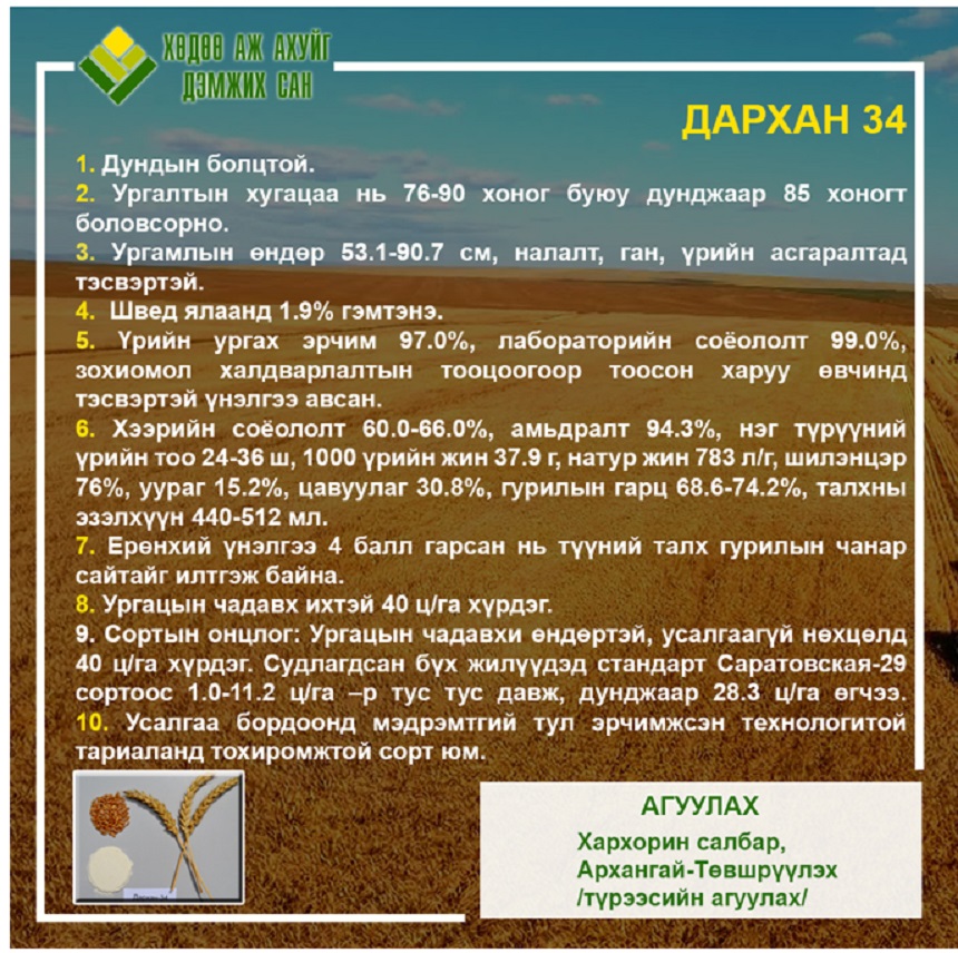 ХХААХҮЯ-ны харьяа Хөдөө аж ахуйг дэмжих сангийн Хөтөл, Хархорин, Угтаал, Булган, Сэлэнгэ салбаруудад улаанбуудайн 10 сортын үрийг хөнгөлөлттэй нөхцөлөөр тариаланчдад нийлүүлж байна. Хаврын тариалалтад зориулан 30 хүртлэх хувийн урьдчилгаатай, намрын ургац хураалтаас үлдэгдэл төлбөрийг төлөх нөхцөлтэйгөөр гэрээ байгуулан дээрх 10 сортын үрийг борлуулж байна.
