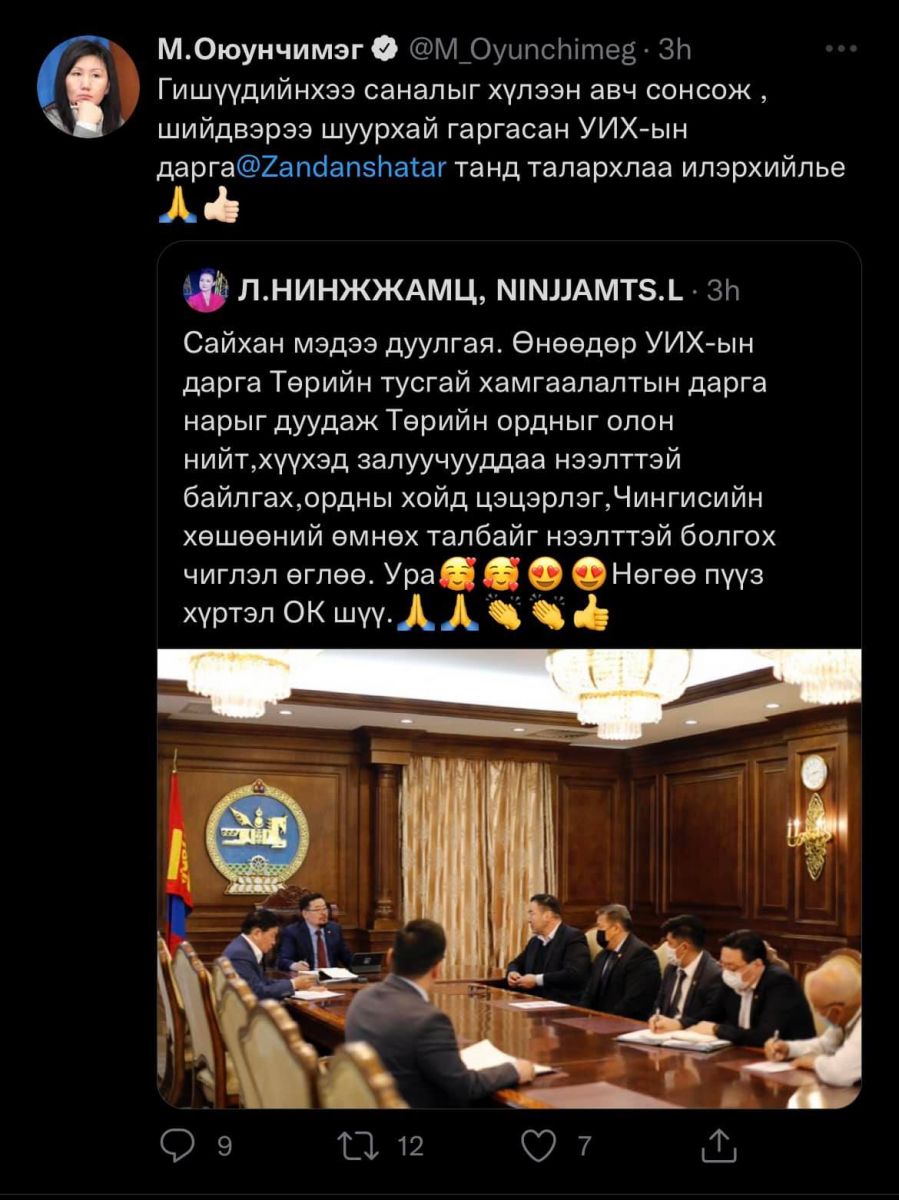 Тэрбээр "Гишүүдийнхээ саналыг хүлээн авч сонсож, шийдвэрээ шуурхай гаргасан УИХ-ын дарга Г.Занданшатар танд талархал илэрхийлье" гэжээ.