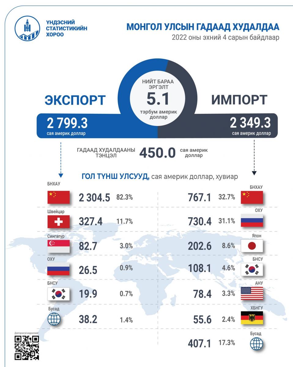 Монгол Улс  энэ  оны эхний дөрвөн сард нийт 134 улстай худалдаа хийж, гадаад худалдааны нийт бараа эргэлт 5.1 тэрбум ам.доллар, үүнээс экспорт 2.8 тэрбум ам.доллар, импорт 2.3 тэрбум ам.доллар байна.