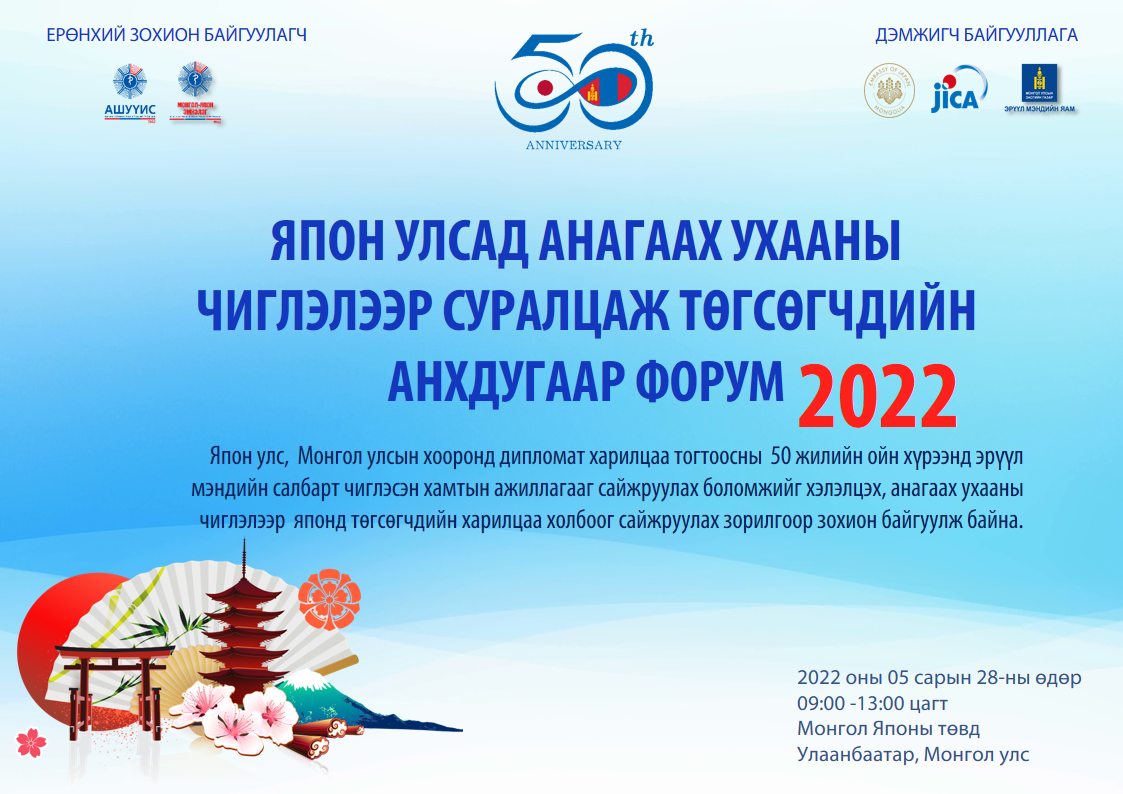 Япон улс, Монгол улсын хооронд дипломат харилцаа тогтоосны 50 жилийн ойн хүрээнд Япон Монгол хоёр улс хоорондын эрүүл мэндийн салбар дахь хамтын үйл ажиллагааг дэмжих, Анагаах ухааны чиглэлээр Японд төгсөгчдийн харилцаа холбоог сайжруулах зорилготойгоор "ЯПОН УЛСАД АНАГААХ УХААНЫ ЧИГЛЭЛЭЭР СУРАЛЦАЖ ТӨГСӨГЧДИЙН АНХДУГААР ФОРУМ"-ыг АШУҮИС, АШУҮИС-ийн Монгол Японы эмнэлэг хамтран зохион байгуулах гэж байна.