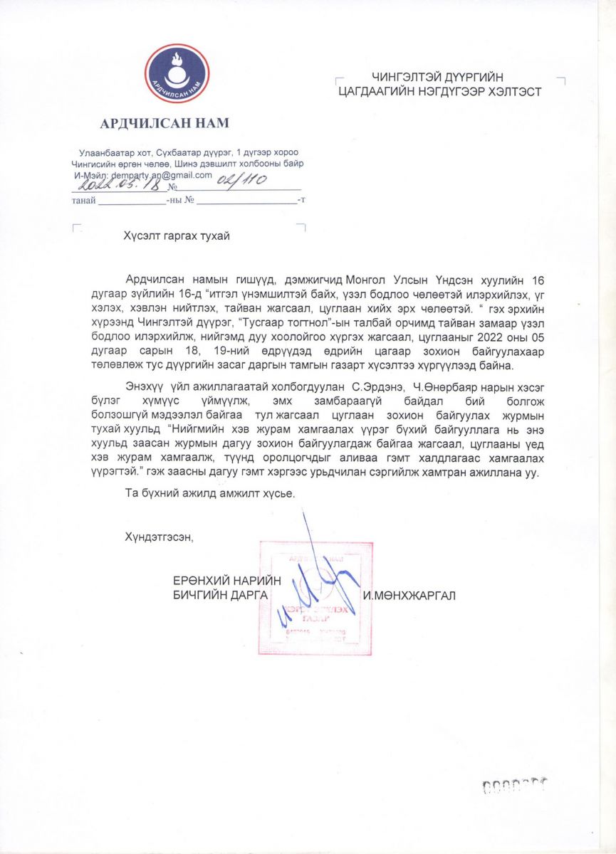 Өөрөөр хэлбэл, О.Цогтгэрэлийн талын АН-ын зүгээс өнөөдөр хоёр дахь өдрөө тайван жагсаалыг зохион байгуулж байна. Ингэхдээ тэрхүү жагсаалыг нь С.Эрдэнэ болон Ч.Өнөрбаяр нарын нөхөд үймүүлж, эмх замбараагүй байдал үүсгэж болзошгүй байгаа талаар О.Цогтгэрэлийн талын АН-ын Ерөнхий нарийн бичгийн дарга И.Мөнхжаргал онцолж, цагдаагийн байгууллагад ханджээ. Ингэхдээ уг жагсаал, цуглааныг үймээн самуун болохоос сэргийлж хамтарч ажиллахыг хүссэн байна.