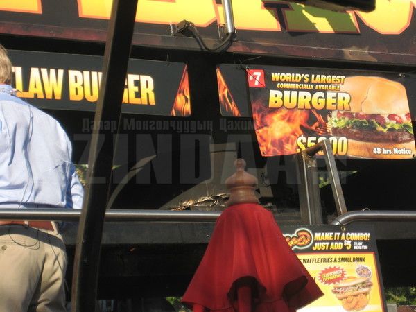 Дэлхийн хамгийн том бургерийг өнгөрсөн амралтын өдөр Канадад хийсэн байна. 777 поундын жинтэй энэ хамбургерийг 15 үхрийн махаар хийжээ. Дэлхийн хамгийн том бругер хийх ажлыг зохион байгуулагч Скот Хаггерти: Бургерийн махийг 14 цаг ноцолдож байж болгосон. 777 гэдэг сайн билэгшээлтэй тоо. Удаан хүлээж хийсэн болохоор их амттай харагдаж байсан. Өмнө нь дэлхийн хамгийн том хамбургер 590 поунд жинтэй байсан юм билээ. Мэдээж хэрэг энэ амжилтыг эвдэхэд амаргүй байсан гэж мэдэгдлээ.