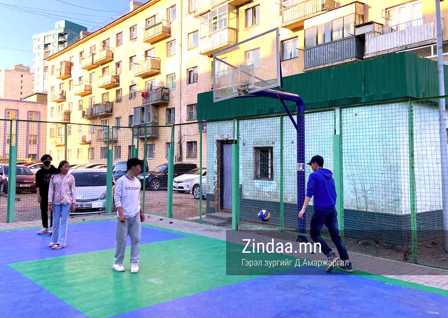 ТБД андуудын зүүн талд байрлах "хуучны таван давхар" гэж нэрлэгдэх шар байрнуудын дунд төмөр тороор хашаалсан нэг л сагсан бөмбөгийн талбай байв. Шийд нь бас л кольцогүй. Энэ талбай дээр хүүхдүүд волейболын бөмбөгөөр тоглож харагдлаа. Хичээлээ тараад ирсэн нэг ангийн хүүхдүүд хамтдаа тоглож байгаа нь энэ аж. "Үүнээс өөр талбай байхгүй. Шороон дээр тоглохгүйн тулд цементэлсэн сагсны талбай дээр нь "төмсдөж" байна" гэв.