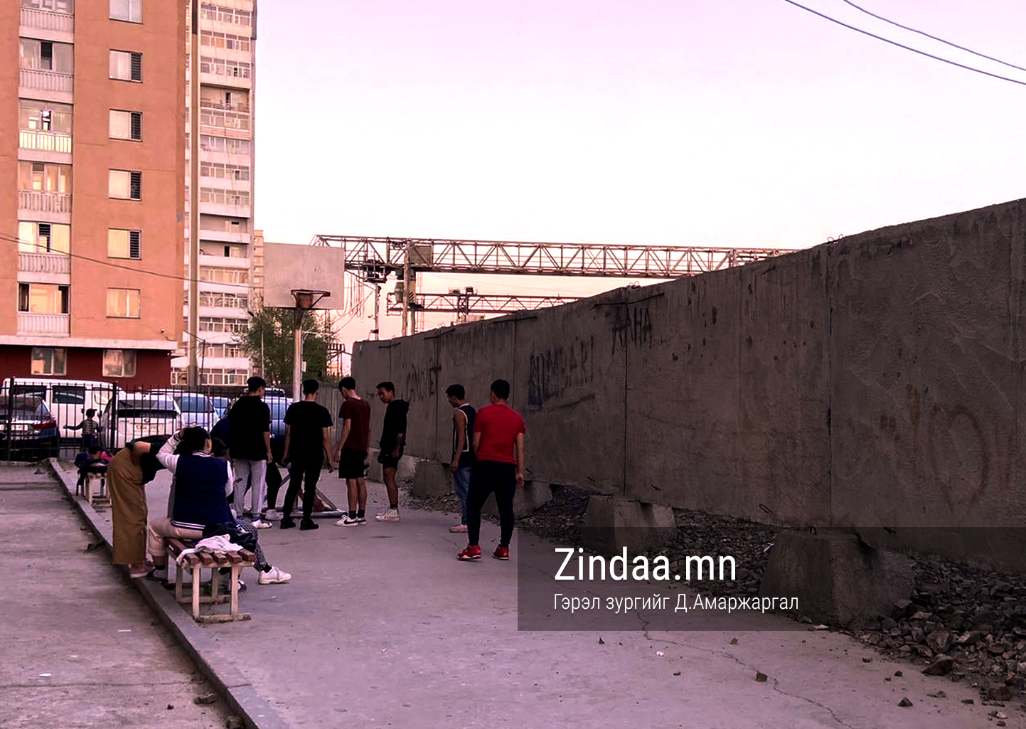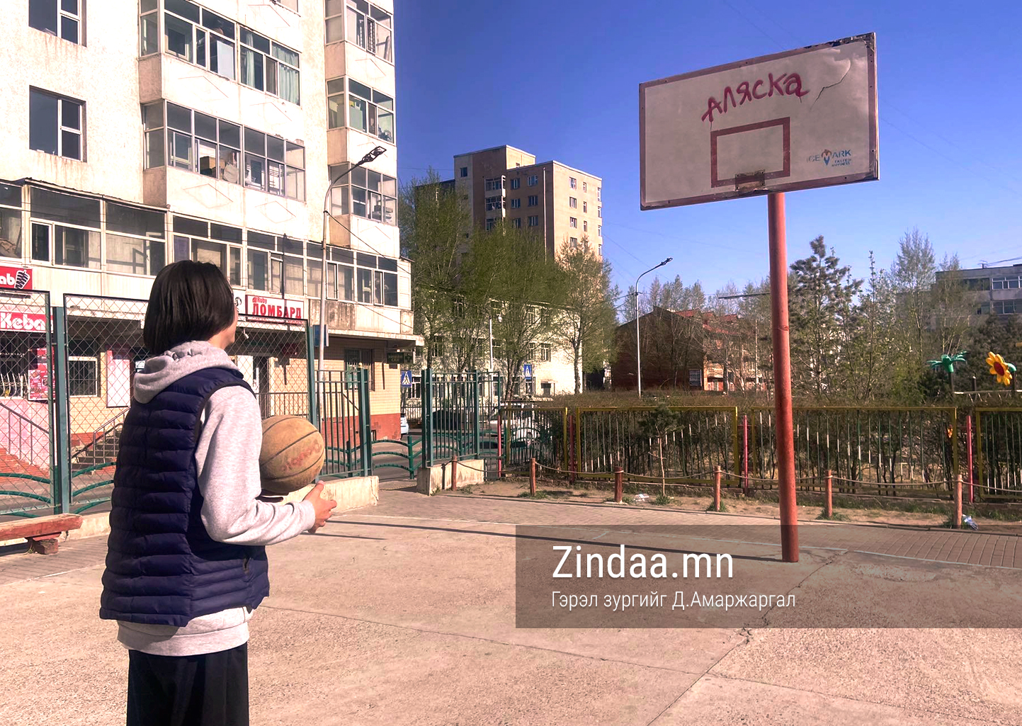 -Орон сууцнуудын дунд байрлах сагсны талбай дээр хүүхдүүд харагдана. Тэд гартаа бөмбөг барьсан байх боловч шийд нь кольцогүй. Тэднээс ийм талбайд яаж тоглож байгааг асуухад "Энэ хавьд сагсны талбай ховор. Бид нар сагс тогломоор байгаа болохоор төсөөллөөрөө л тоглочихдог юм" гэлээ. Хүүхдүүд чөлөөт цагаа гадаа тоглож өнгөрүүлэхийг хүсэж байгаа ч тэдэнд тоглох орчин алга.