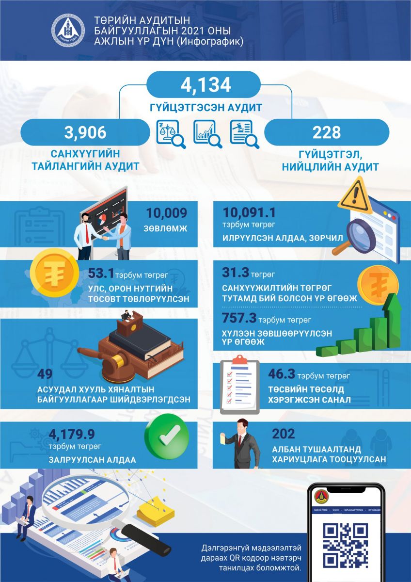 Төрийн аудитын байгууллага 2021 оны үйл ажиллагааны тайлангаа УИХ-ын Төсвийн байнгын хорооны хуралдаанд танилцуулахдаа, аудитын дүнгээр 10 их наяд төгрөгийн алдаа, зөрчил илрүүлсэн гэж мэдэгдлээ. Төрийн аудитын байгууллагаас өнгөрсөн онд 4134 аудит хийж дүгнэлт, тайлан гаргажээ.