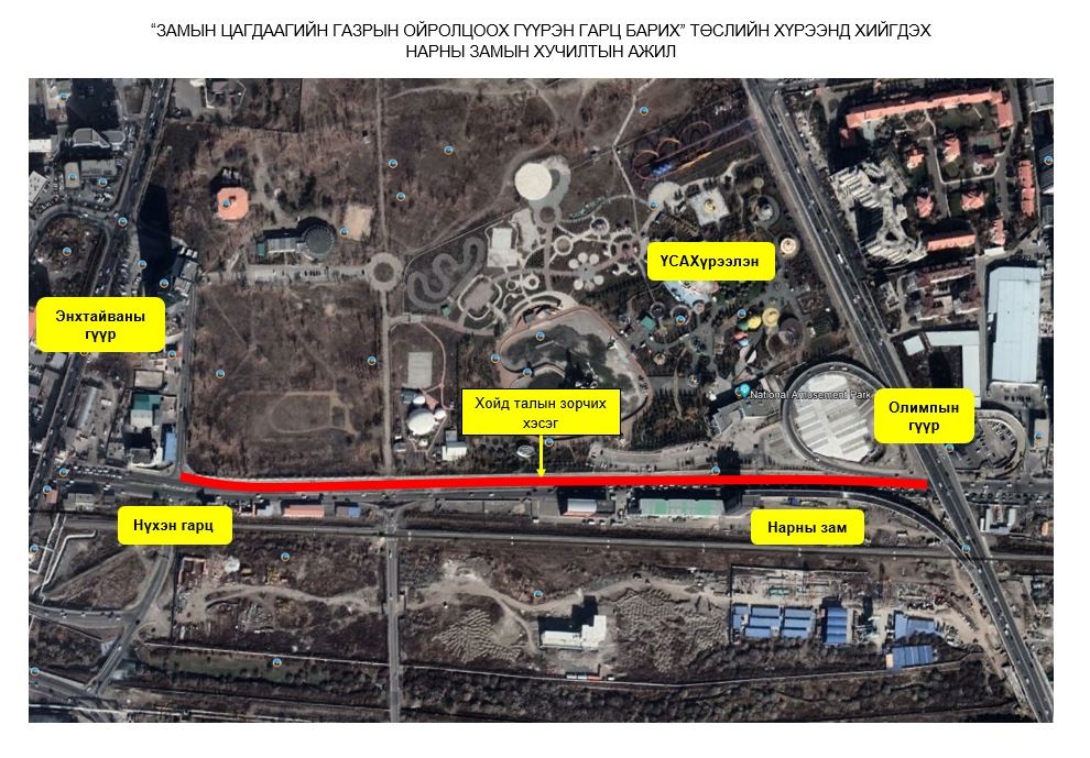 Тус ажлын хүрээнд Олимпын гүүрнээс Соёолжийн нүхэн гарц хүртэлх авто замын асфальт бетон хучилтын ажлыг гүйцэтгэсэн бол 2022 оны тавдугаар сарын 23-ны 23:00 цагаас тавдугаар сарын 27-ны 22:00 цаг хүртэл Олимпын гүүрнээс Энхтайваны гүүрийн зүүн талын уулзвар хүртэлх зүүнээс баруун чиглэлийн хөдөлгөөнийг хэсэгчлэн хааж,  асфальт бетон хучилтын ажил хийнэ. Иймд иргэд,  жолооч нар дээрх хугацаанд Нарны замаас бусад замыг сонгон хөдөлгөөнд оролцохыг хүсье.