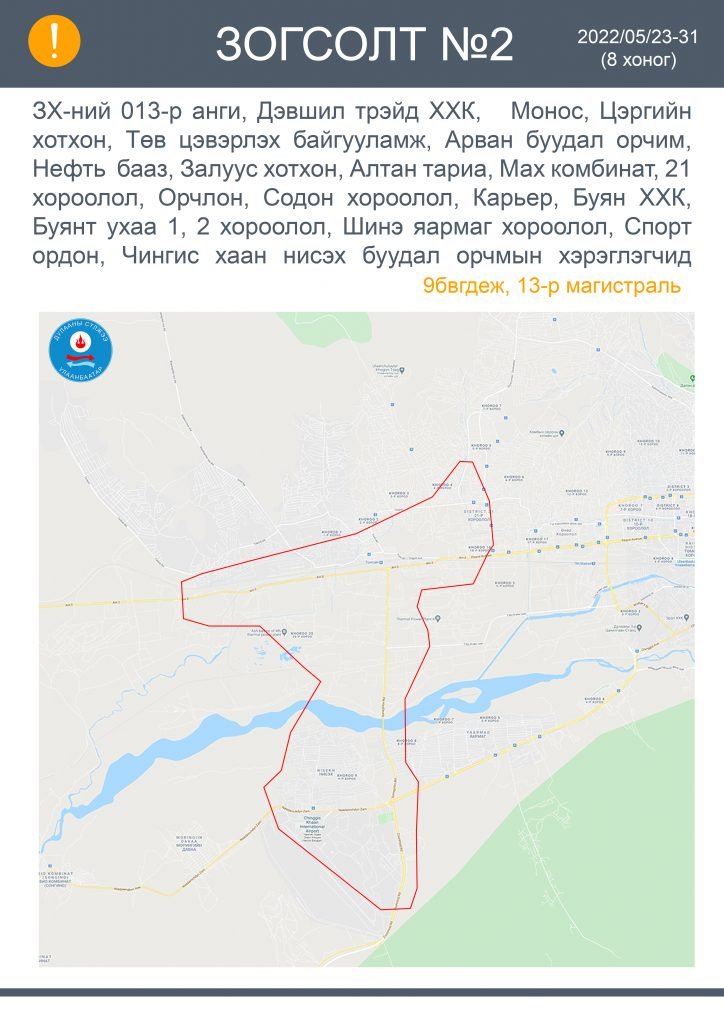 Өнөөдрөөс эхлэн тавдугаар сарын 31-нийг хүртэл дараах хороолол, хотхоны хэрэглээний халуун усыг найм хоногийн хугацаанд хязгаарлана.