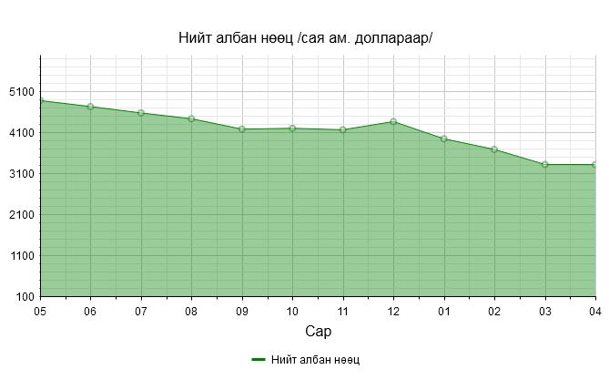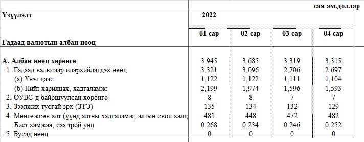 Гадаад валютын албан нөөц энэ оны дөрөвдүгээр сарын байдлаар 3314.8 сая ам.доллар байна.