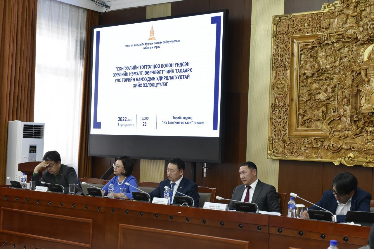 Улсын Их Хурлын Төрийн байгуулалтын байнгын хорооноос “Сонгуулийн тогтолцоо болон Үндсэн хуулийн нэмэлт, өөрчлөлт” сэдвийн дор цуврал хэлэлцүүлгийг өнөөдөр /2022.05.25/ зохион байгуулж байна.