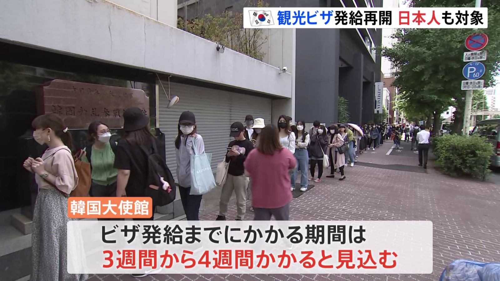 БНСУ-ын Засгийн газраас зургаадугаар сарын 1-нээс жуулчны визаны материал хүлээн авч эхэлсэн билээ. Өчигдөр Токио хотын Азабүжюбан дүүрэгт орших Өмнөд Солонгосын Консулын газрын өмнө олон хүн дугаарлан зогсож байлаа. Тэр өдрийн визаны баримт хүлээн авах хүний тоо гүйцсэн ч маргааш өглөө хүртэл хонож, хүлээнэ гэх хүн маш олон байна.