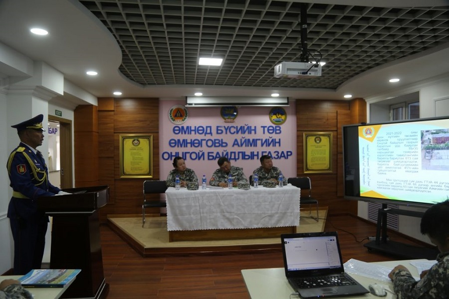 ОБЕГ-ын тэргүүн дэд дарга, хурандаа Ж.Чүлтэмсүрэнгээр ахлуулсан ажлын хэсэг Өмнөд бүсийн төв-Өмнөговь аймгийн Онцгой байдлын газарт ажиллаж байна. Ажлын хэсгийн бүрэлдэхүүн газар, хэлтэс, анги, байгууллагын алба хаагчидтай уулзалт хийх үеэр аймгийн Онцгой байдлын газрын орлогч, урьдчилан сэргийлэх тасгийн дарга, хошууч И.Идэргарав байгууллагын үйл ажиллагааны талаар танилцууллаа.