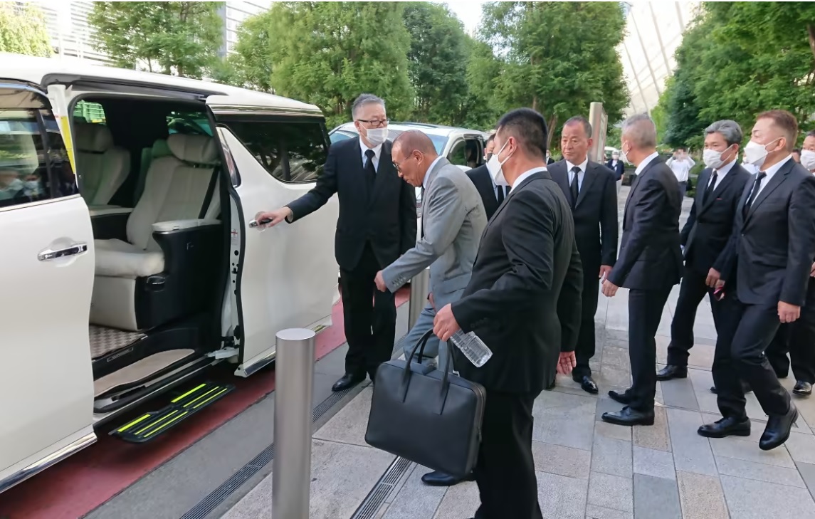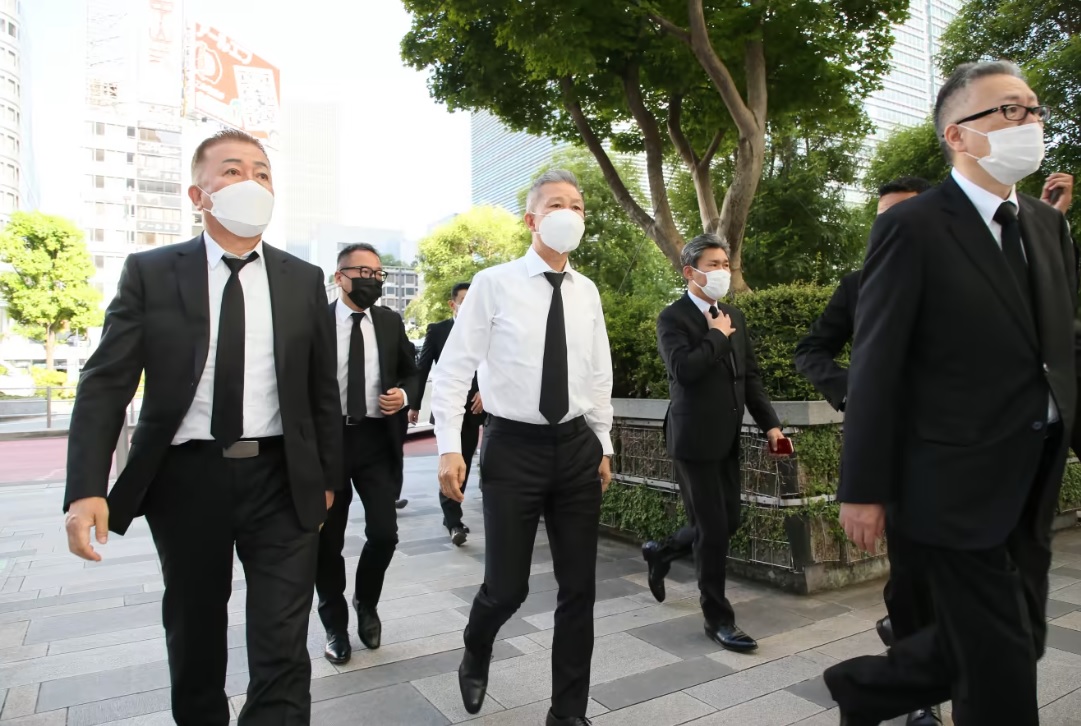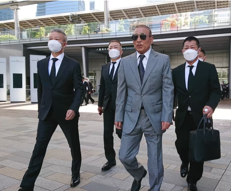 16 цаг болох үед бие хамгаалагчдаар хүрээлүүлсэн нэгэн эр буудлаас гарч ирсэн нь Японы хамгийн том бүлэглэл болох Ямагүчи бүлгийн босс Кэничи Шинода байлаа. Шинода саарал костюмтай, хар зангиа, нарны шил зүүжээ.