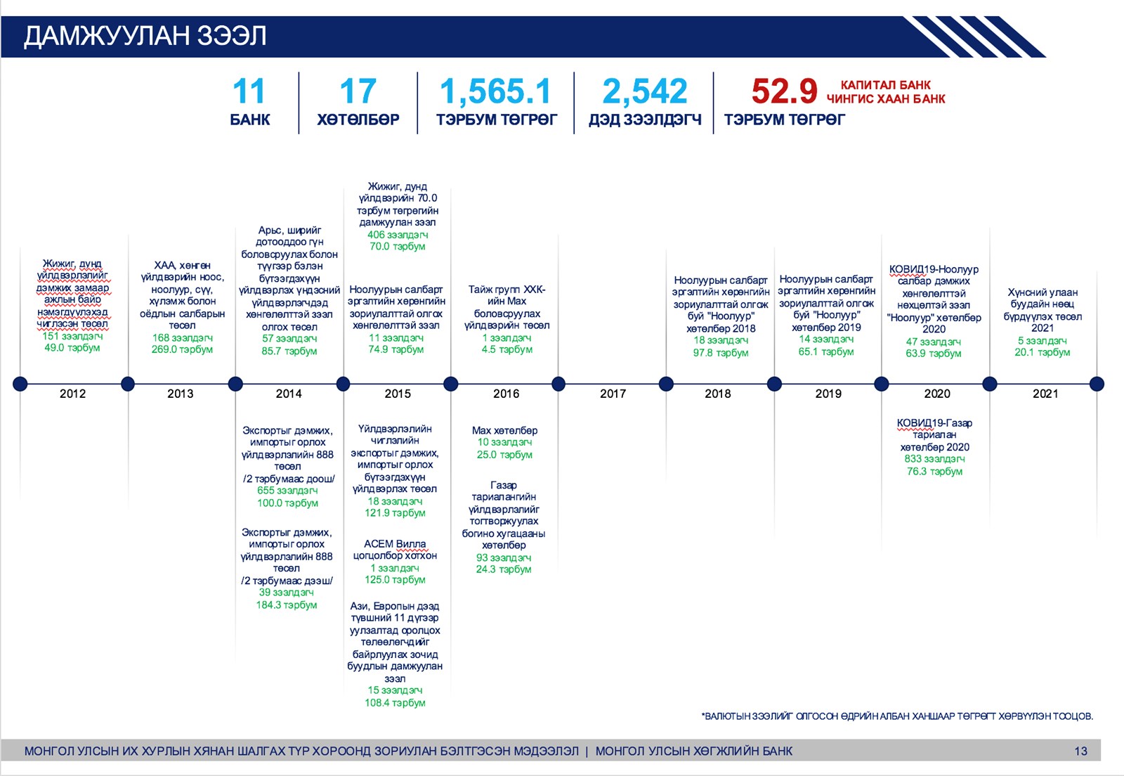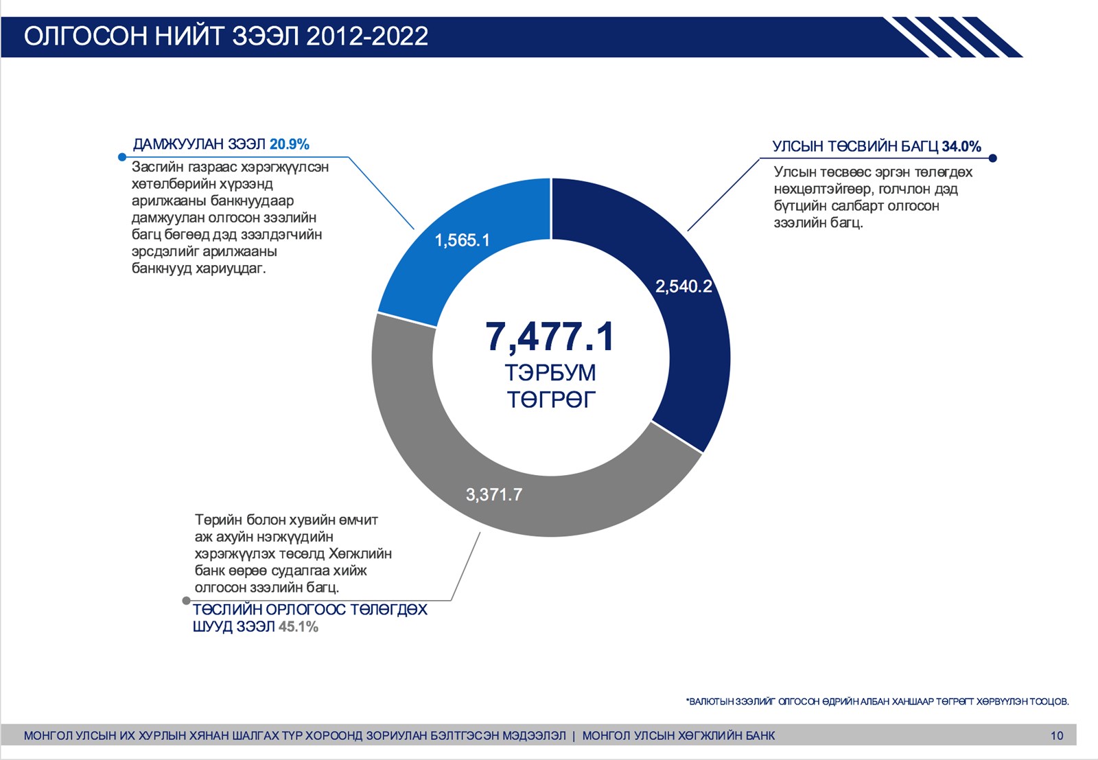 Дамжуулан зээл 1 их наяд 565 тэрбум /Засгийн газраас хэрэгжүүлсэн хөтөлбөрийн хүрээнд арилжааны банкуудаар дамжуулан олгосон зээлийн багц бөгөөөд дэд зээлдэгчийн эрсдэлийг арилжааны банкууд хариуцдаг/