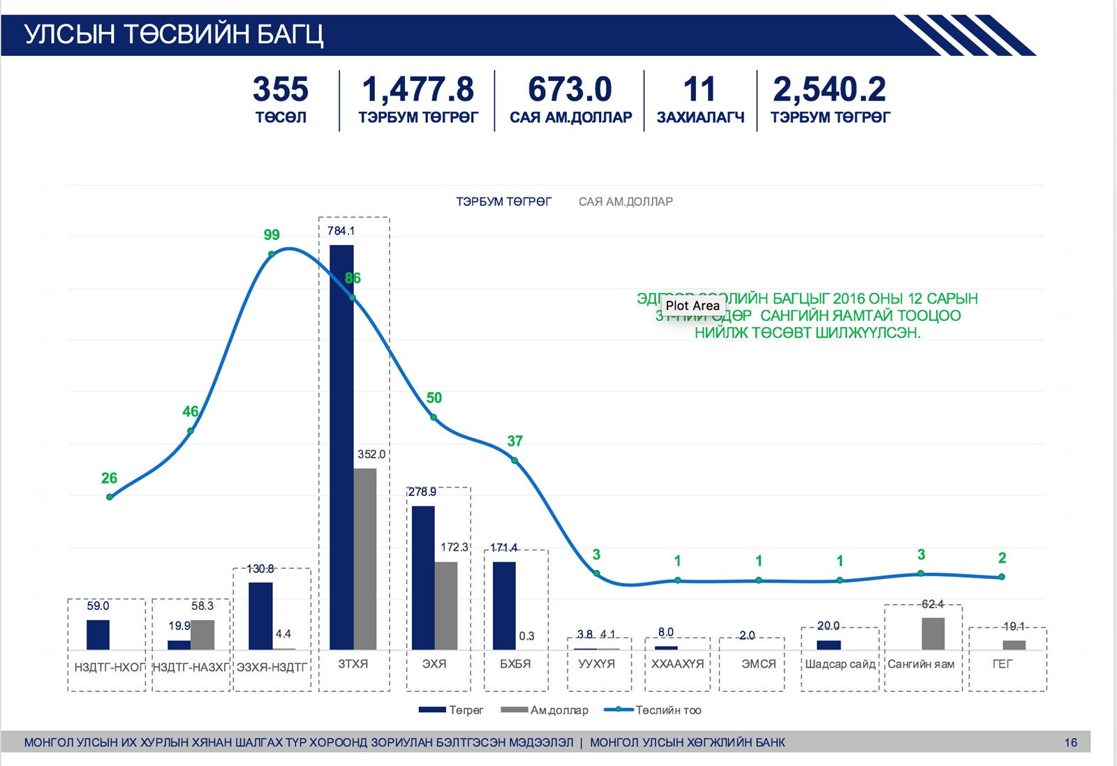 2016 онд төсөвт шилжүүлсэн багцын хувьд 355 төсөлд 1 их наяд 477 тэрбум төгрөг болон 673 сая ам.долларын зээл олгожээ.
