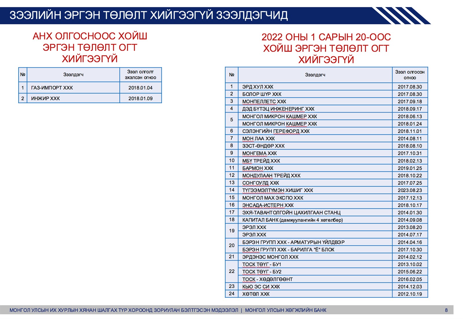2018 онд анх зээл олгосноос хойш эргэн төлөлт огт хийгээгүй Газ-Импорт ХХК, Инжир ХХК байна. Харин 2022 оны 1 дүгээр сарын 20-иос хойш эргэн төлөлт хийгээгүй 24 зээлдэгч байна.