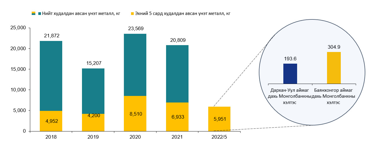 Оны эхнээс өссөн дүнгээр Дархан-Уул аймаг дахь Монголбанкны хэлтэс 193.6 кг, Баянхонгор аймаг дахь Монголбанкны хэлтэс 304.9 кг үнэт металл тус тус худалдан авчээ.