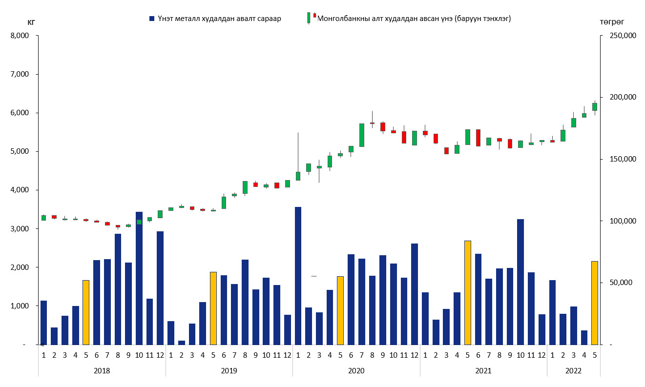 Монголбанк энэ оны тавдугаар сард 2,152.0 кг үнэт металл худалдан авч, оны эхнээс өссөн дүнгээр 6 тонн үнэт металл худалдан аваад байна. Энэ нь өмнөх оны мөн үетэй харьцуулбал 14 хувиар буурсан үзүүлэлт байна.