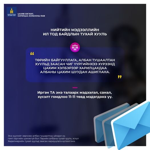 Энэ жилийн 5 дугаар сарын 1-нээс хэрэгжиж эхэлсэн Нийтийн мэдээллийн ил тод байдлын тухай хуулийн дагуу төрийн албан хаагч нь иргэн, хувийн хэвшлээс хувийн и-мэйл хаягаар мэдээлэл авах, хувийн и-мэйл хаягаар харилцахыг хориглосон болно.