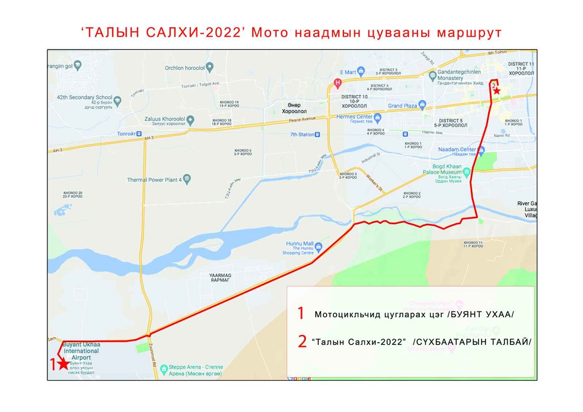 Зургадугаар сарын 11-ний өдөр мото спортынхон Хан-Уул дүүргийн “Буянт ухаа” цогцолбор-Хүннү молл-Уулын зам–Наадам центр-Сүхбаатарын талбай гэсэн чиглэлд парад жагсан орж ирэх юм. Үүнтэй холбоотойгоор дээрх чиглэлд 12:00-14:00 цагийн хооронд хэсэгчилж зам хаана. Цагдаагийн ерөнхий газрын Тээврийн цагдаагийн албаны Замын хөдөлгөөн хяналтын газраас 30 цагдаагийн албан хаагч ажиллаж, замын зохицуулалт хийхээр болжээ.