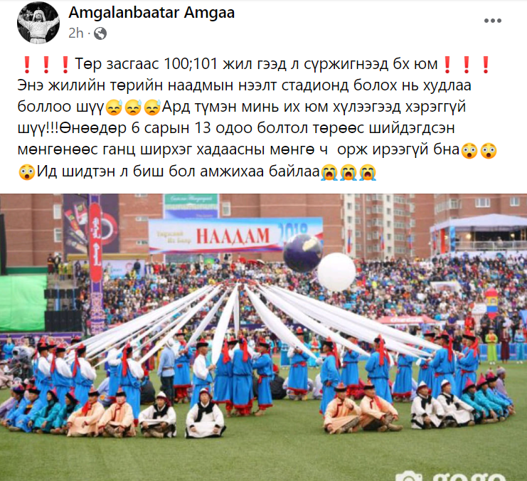 Тэрээр "Төр засгаас 100, 101 жил гээд л сүржигнээд байх юм. Энэ жилийн төрийн наадмын нээлт стадионд болох нь худлаа боллоо шүү. Ард түмэн минь их юм хүлээгээд хэрэггүй шүү!!! Өнөөдөр зургаадугаар сарын 13. Одоо болтол төрөөс шийдэгдсэн мөнгөнөөс ганц ширхэг хадаасны мөнгө ч орж ирээгүй байна. Ид шидтэн л биш бол амжихаа байлаа" хэмээн бичжээ.
