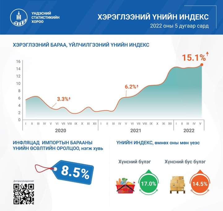 2022 оны тавдугаар сард улсын хэмжээнд хэрэглээний бараа, үйлчилгээний үнэ өмнөх оны мөн үеэс 15.1 хувь, өмнөх оны эцсээс 7.9 хувиар өссөн байна.