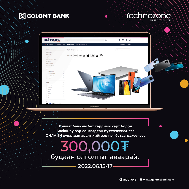 Голомт банк онлайн худалдан авалтын ээлжит урамшууллаа Technozone-той хамтран зарлаж байна. Харилцагч та www.technozone.mn вэбсайтаас Голомт банкны бүх төрлийн карт болон SocialPay аппликэйшн ашиглан хийсэн худалдан авалт бүрдээ 300,000₮-ийн буцаан олголт аваарай.