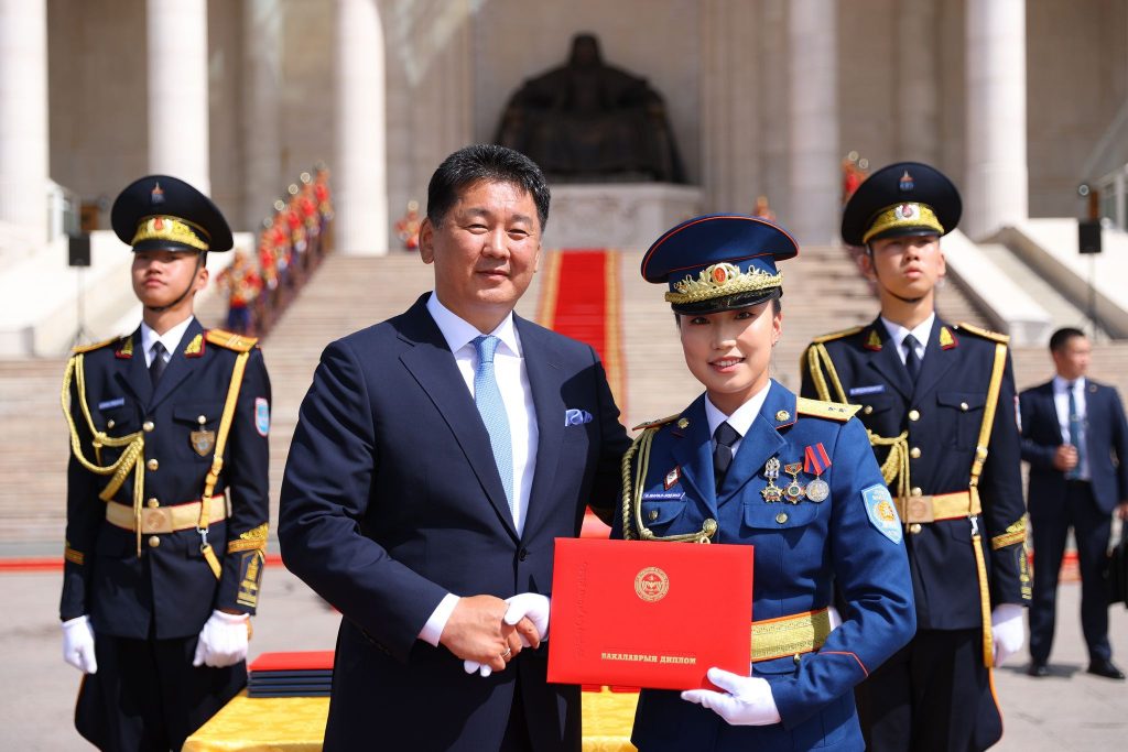 Монгол Улсын Ерөнхийлөгч, Зэвсэгт хүчний Ерөнхий командлагч Ухнаагийн Хүрэлсүх шилдэг төгсөгчдөд энгэрийн тэмдэг, диплом гардуулсныхаа дараа баяр хүргэж үг хэллээ.