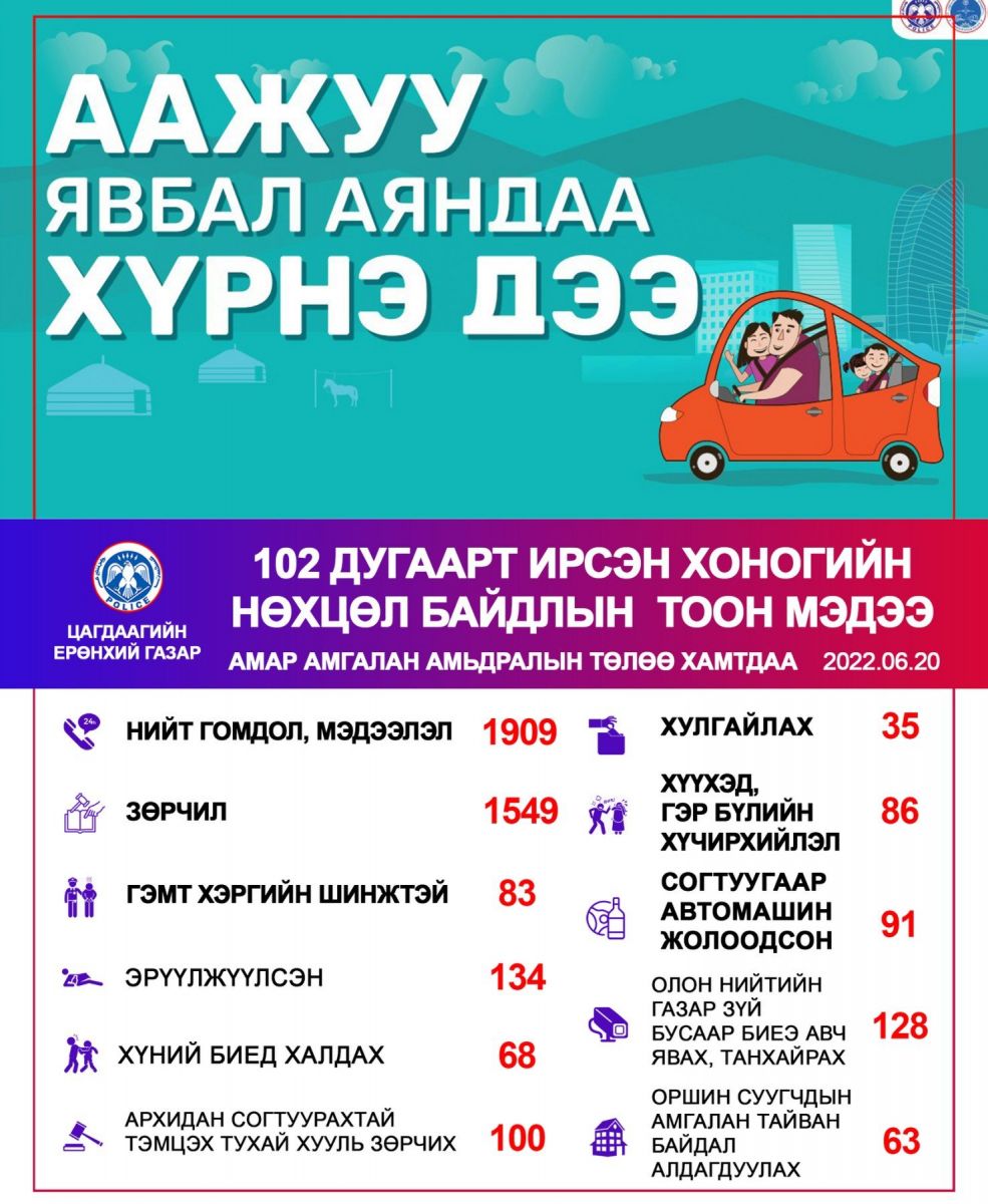 Цагдаагийн байгууллагад өнгөрсөн хоногт нийт 1909 дуудлага, мэдээлэл бүртгэгджээ. Үүнээс зөрчлийн шинжтэй 1549, гэмт хэргийн шинжтэй 83 дуудлага бүртгэгдсэн байна.