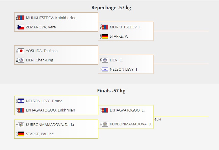 ОУХМ Мөнхцэдэвийн Ичинхорлоо Солонгосын бөхийг ялаад дараа нь Израйлын Тимна Нельсон Левид ялагдсан. Дагах барилдаанд Чехийн Земановаг ялаад Германы Паулин Старкетэй хүрэл медалийн төлөө хүч үзэх болсон.