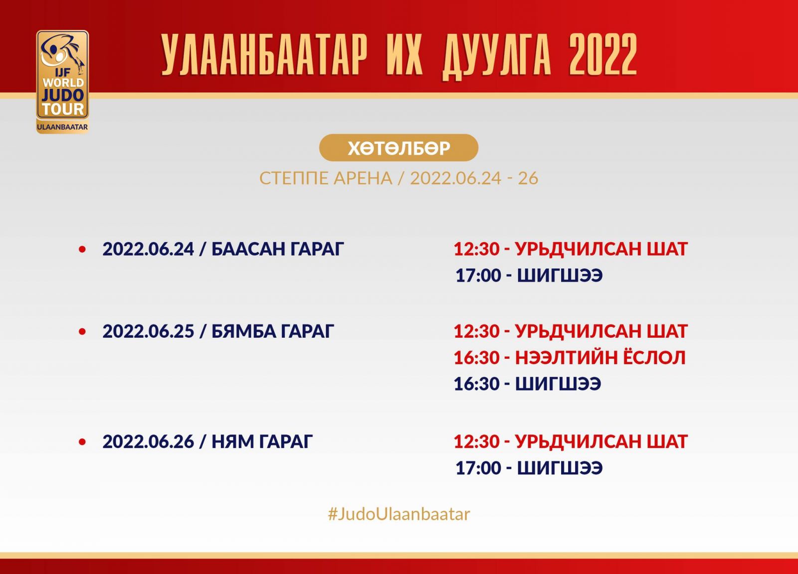 Өнөөдөр (2022.06.24) Улаанбаатар хотын "Мөсөн ордон"-д эхэлсэн жүдо бөхийн "Их Дуулга" буюу Гранд Слам ангиллын тэмцээний эхний өдрийн барилдаан өндөрлөлөө.