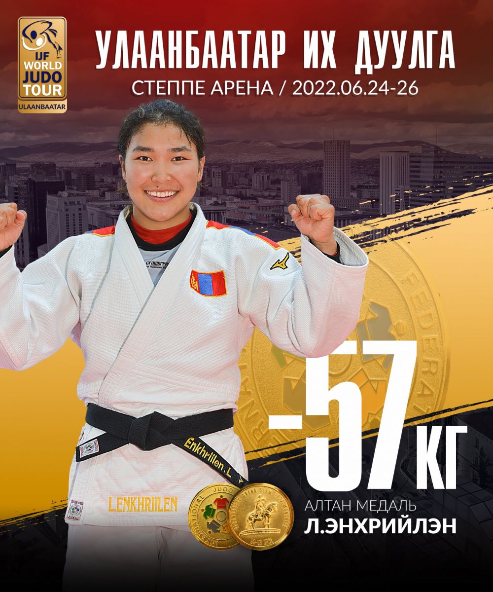 “Улаанбаатар Их дуулга" тэмцээний эхний өдрийн төгсгөлд эмэгтэйчүүдийн -57 кг-ын жинд ОУХМ Л.Энхрийлэн аваргын алтан медаль хүртлээ.