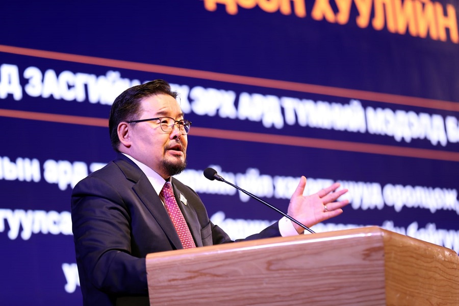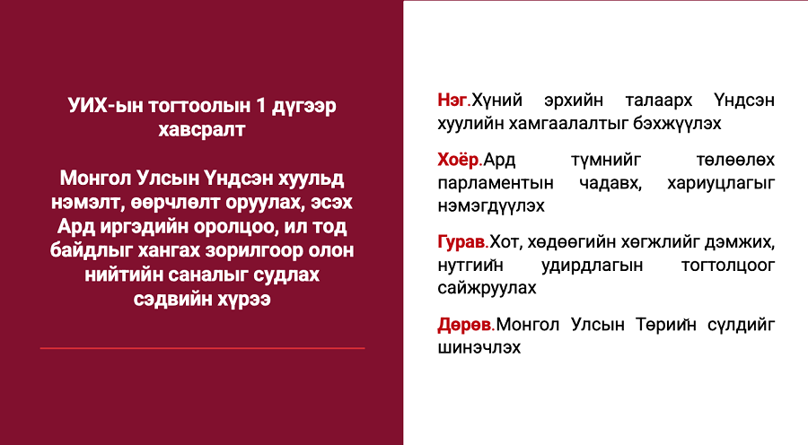 Улсын Их Хурлын дарга үргэлжлүүлэн “Монгол Улсын Үндсэн хуулийн нэмэлт, өөрчлөлт: Иргэдийн оролцоо, ил тод байдал” сэдвийн хүрээнд хийсэн мэдээллийн эхэнд Улсын Их Хурлын 2022 оны 06 дугаар сарын 16-ны өдрийн “Монгол Улсын Үндсэн хуульд нэмэлт, өөрчлөлт оруулах, эсэх асуудлаар ард түмний оролцоо, ил тод байдлыг хангах ажлыг зохион байгуулах тухай” тогтоолыг танилцуулав.
