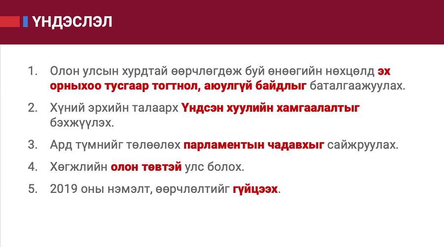 Энэ хүрээнд хууль тогтоох үйл хэрэгт олон нийтийн санал бодлыг тусгах, иргэдийн эрх ашигт нийцсэн бодлого, шийдвэрийг гаргах, тэдний дуу хоолойг хүргэх, ард олны засаглах эрхийг хангах зорилгоор “D-Parliament” цахим хуудас, аппликейшн хосолсон платформыг хөгжүүлээд байна. Олон нийтийн саналд тулгуурлан цахим платформын хөгжүүлэлтийг цаашид илүү боловсронгуй, хүртээмжтэй болгохоор зорьж байгаа юм. Иймд төрийн үйл ажиллагаанд идэвхтэй оролцохыг уриалж байна гэлээ.