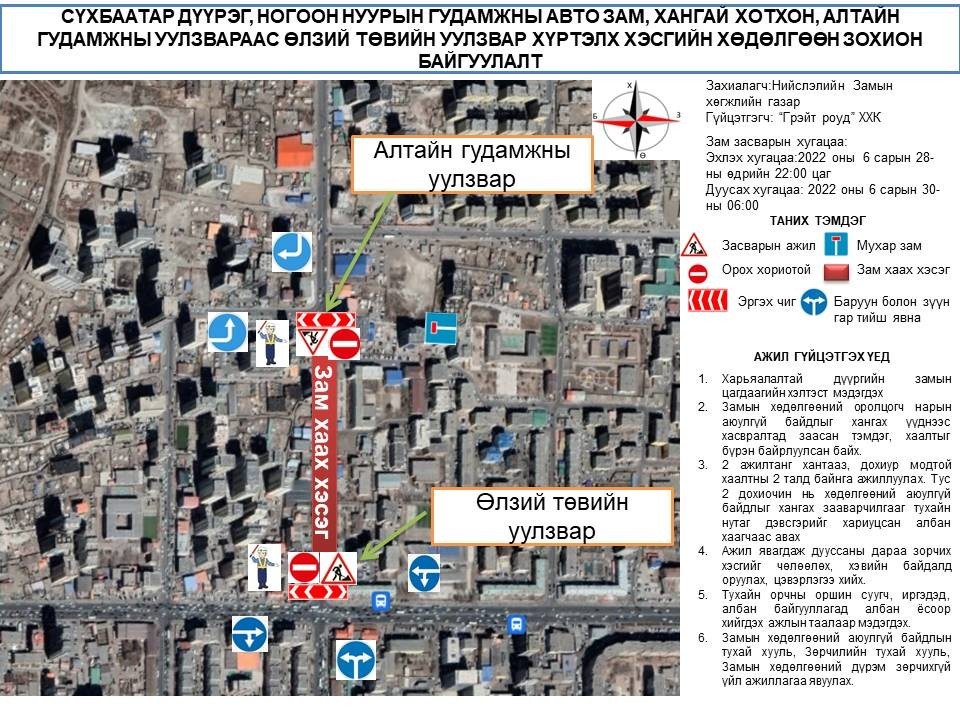 Тэгвэл зургадугаар сарын 28-ны 22:00 цагаас 30-ны 06:00 цаг хүртэл замын хөдөлгөөнийг хязгаарлаж, асфальт бетон хучилт хийх гэж байна. Тус өдрүүдэд Хангай хотхоны уулзвараас Хүнсний 4-р дэлгүүрийн хойд уулзвар хүртэлх замын зорчих хэсгийг хаах тул иргэд, жолооч та бүхэн бусад замыг сонгон хөдөлгөөнд оролцоно уу.