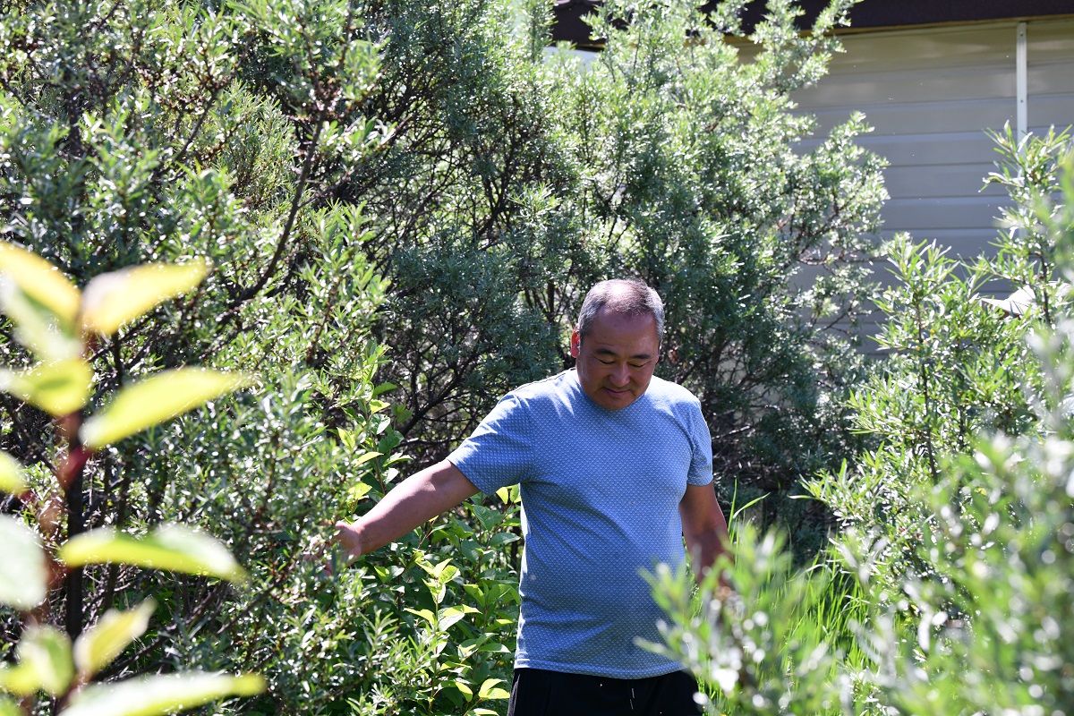 Тэрээр “Мод бүхэн түүх өгүүлдэг. Анх хоёр гацуур авчраад тарьсан ч төд удалгүй үхчих шиг болохоор нь нэгийг сугалаад хаячихсан. Тэгсэн хоёр жилийн дараа үлдсэн гацуурынх нь хатсан ишнээс дахин шинэ иш салаалаад ургачихсан” гээд ихэд хөөрөн ярьж байлаа. Жимсээ өгдөг бутнууд бол арчилгаа ихээхэн шаарддаг. Үхрийн нүдний бутыг хавар цас орох үед даарчих байх гээд хөнжил, гудсаа гаргаж ирээд хүүхэд өлгийдөж байгаа юм шиг л ороодог гэв. Ийнхүү тойглож байж жимсээ өгдөг байна. Түүний ач охин нь үхрийн нүд жимсээ өгөөд эхлэхээр өөрөө түүгээд л идчихдэг гэнэ. “Хүүхэддээ жимс түүж өгөх биш, жимс түүх аргыг зааж өгөх хэрэгтэй. Эхэндээ түүж идэж чадахгүй гараа хатгуулна. Сүүлдээ өөрөө түүж иддэг болно. Бэлэнчлэх сэтгэлгээ суулгаж болохгүй” гэж зөвлөсөн юм.