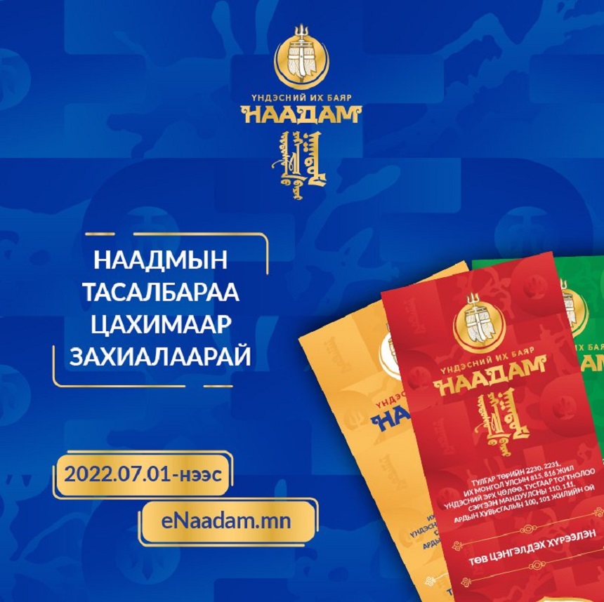 Үндэсний их баяр наадмын тасалбарыг энэ жилээс цахимаар борлуулахаар болсон. Тодруулбал, www.enaadam.mn цахим сайтаар долоодугаар сарын 1-ний өдрөөс борлуулж эхлэх юм.
