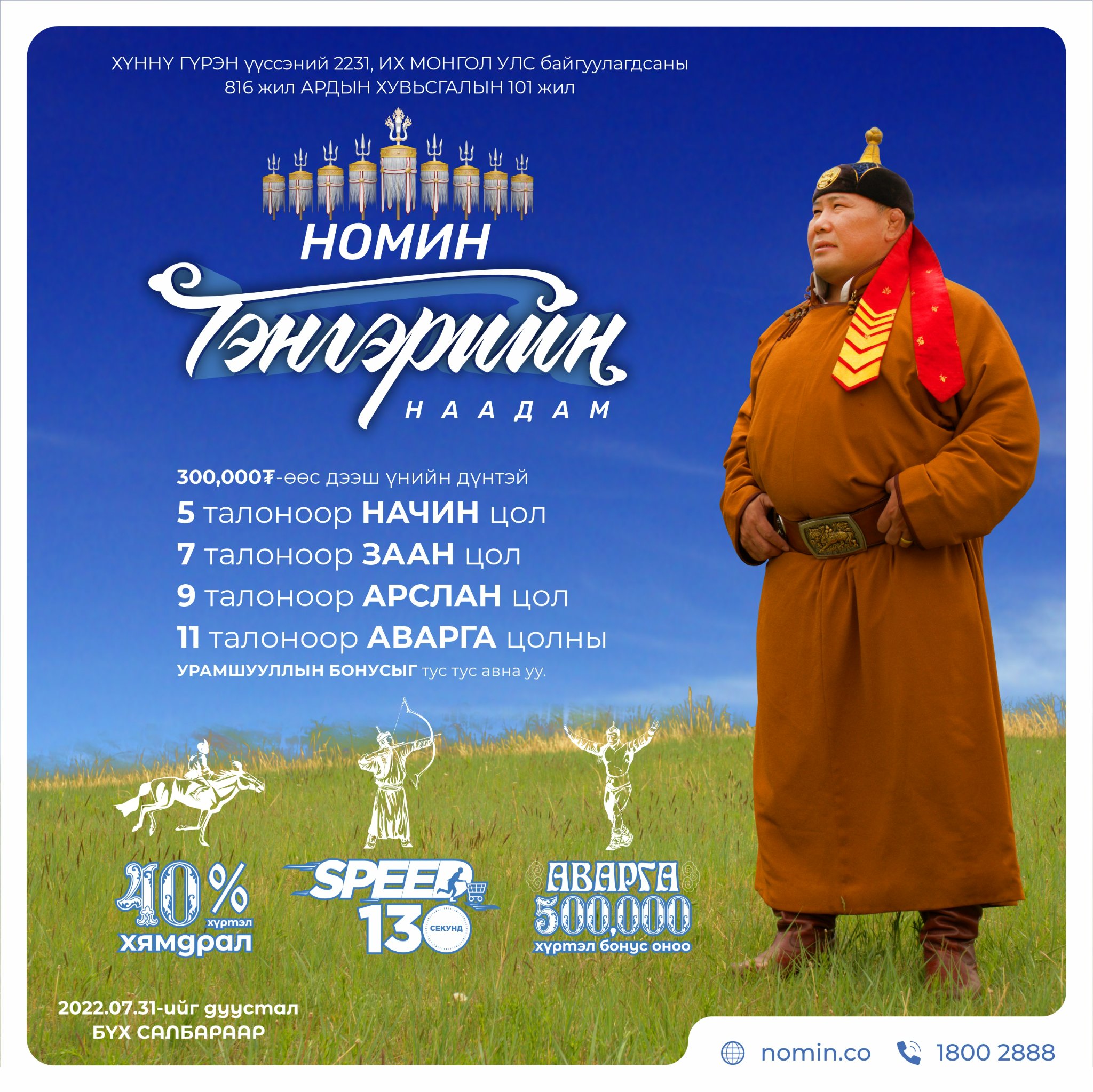 НОМИН-д 40% хүртэл ХЯМДРАЛТАЙ, 5 төрлийн КУПОНТОЙ, "SPEED130" урамшууллын эрхтэй, хэрэглэгч бүртээ дөрвөн хүчтэний бэлэг амлаж, 500,000 төгрөг хүртэлх бонус оноогоор АВАРГА цолоо байлах НААДМЫН НЭГДСЭН УРАМШУУЛАЛТ ХӨТӨЛБӨР эхэллээ.