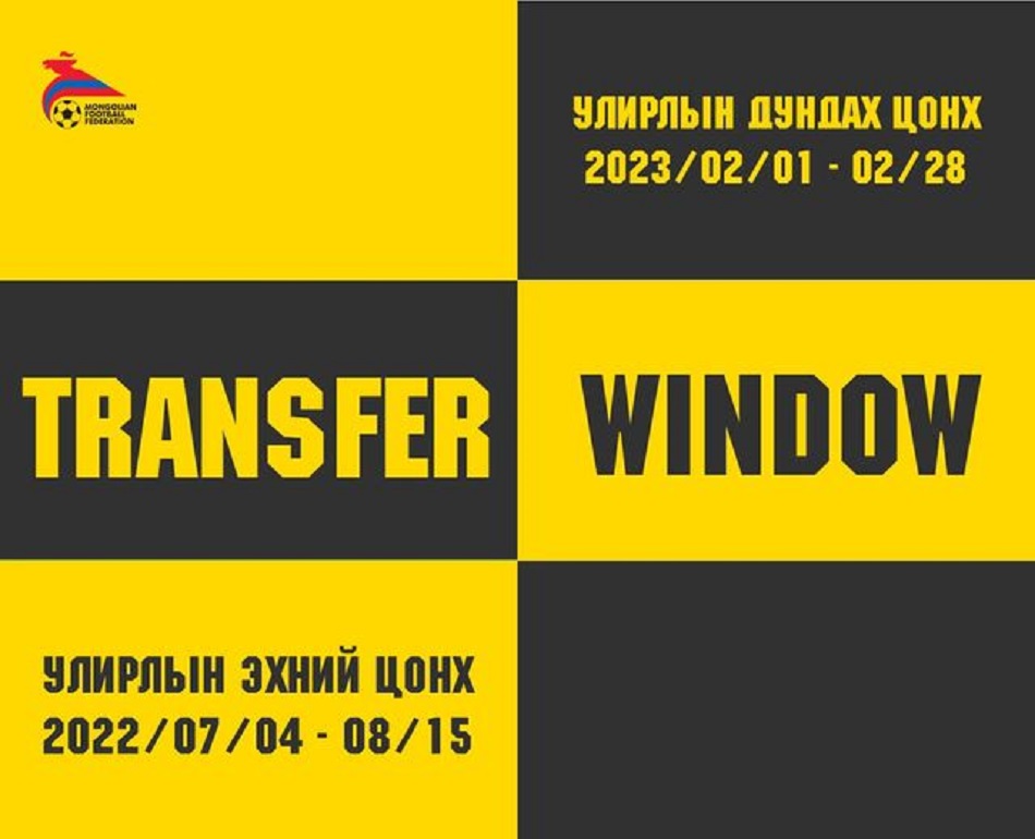 Монголын Хөлбөмбөгийн Холбоо нь намар хаврын тойргийн системээр тэмцээнүүдийг зохион байгуулж эхэлсэн бөгөөд, 2022 – 2023 оны улирлын тоглогчдын шилжилт хөдөлгөөний цонх 2022.07.04 – нөөс эхлэн нээгдэж сар гаруй хугацаанд үргэлжилж 2022.08.15-ны өдөр 00:00 цагаас хаагдана.
