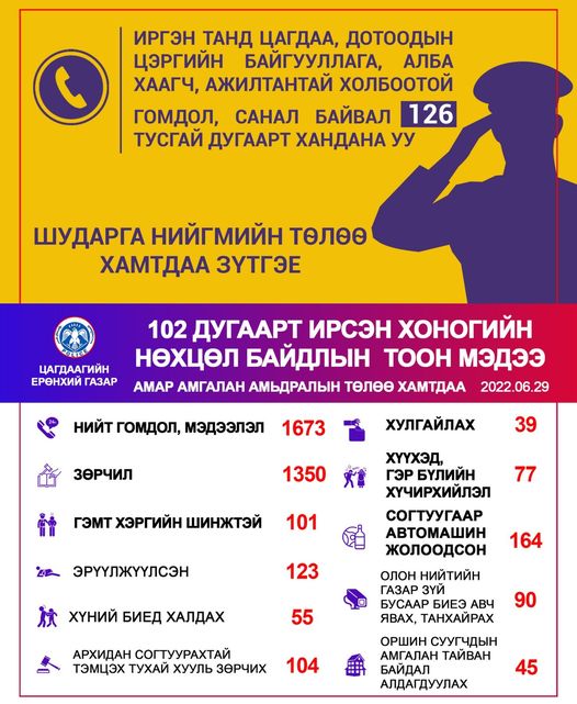 Цагдаагийн байгууллагын 102 тусгай дугаарт өчигдөр буюу зургаадугаар сарын 29-ний өдөр нийт 1673 дуудлага, мэдээлэл бүртгэгдсэн байна.