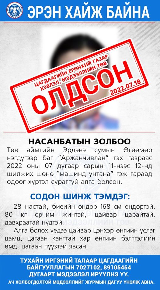 Долоодугаар сарын 11-ний өдөр “Ар Жанчивлан” амралт, сувиллын ойролцоо айлаас гарч явсан зургаан сартай жирэмсэн эмэгтэйг цагдаагийн байгууллагаас хайж байгаа тухай мэдээлсэн.