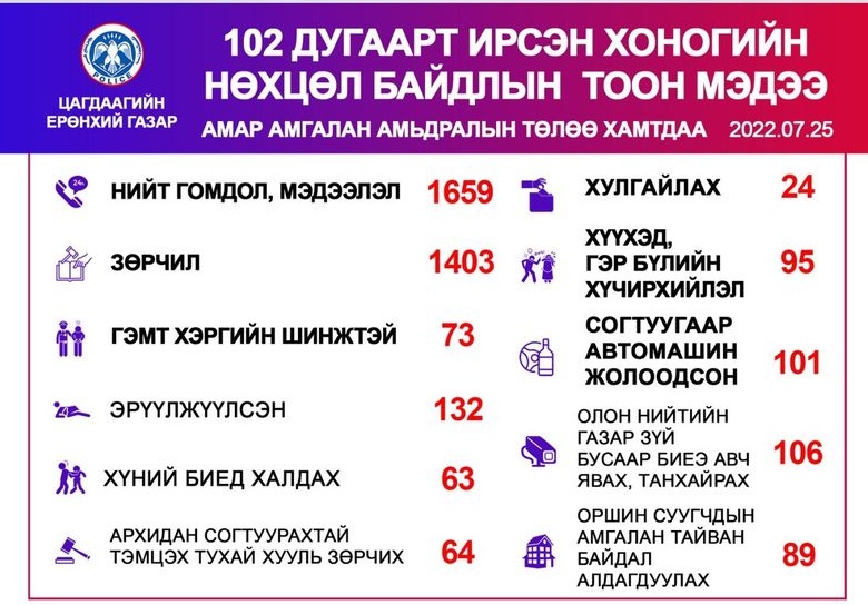 Цагдаагийн байгууллагын 102 тусгай дугаарт өчигдөр буюу долоодугаар сарын 25-ны өдөр нийт 1659 дуудлага, мэдээлэл бүртгэгдсэнээс зөрчлийн шинжтэй 1403, гэмт хэргийн шинжтэй 73 дуудлага, мэдээлэл иржээ.