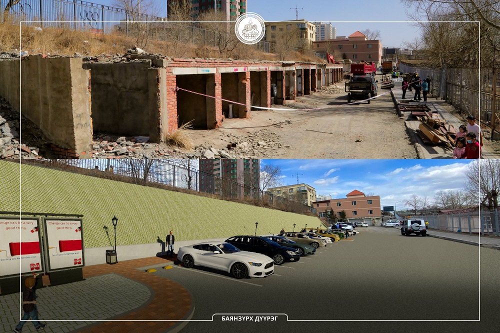 Тухайлбал Орос 14-р сургуулийн хойно байрлах 54 гараашийг буулган газрыг чөлөөлөөд байсан. Тухайн хэсэгт ил зогсоол, ногоон байгууламж, явган зам хийж гүйцэтгэх саналыг иргэд ирүүлсэн. Энэ дагуу тохижилт, бүтээн байгуулалтын ажил хийгдэж байна. Нийт 2161 м.кв талбайд тохижилт хийгдэх бөгөөд энэ ажлыг Баянзүрх дүүргийн хөрөнгө оруулалт бүтээн байгуулалтын төвийн хамт олон гүйцэтгэж байгаа гэж Баянзүрх дүүргээс мэдээллээ.