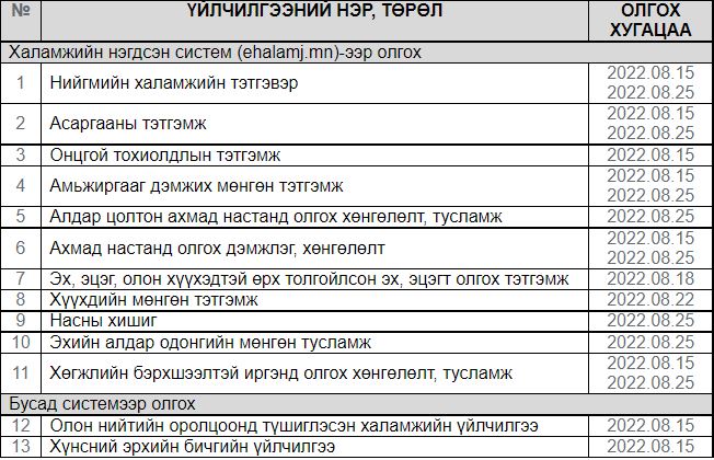 Нийгмийн халамжийн тэтгэвэр, тэтгэмж, хөнгөлөлт, тусламжийн 2022 оны наймдугаар сарын олголтын хуваарийг танилцуулж байна