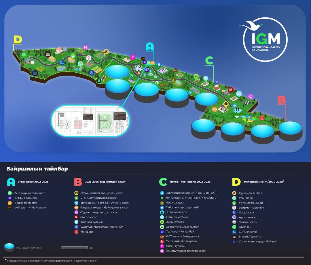 Баянзүрх дүүргийн 23, 28-р хорооны нутаг дэвсгэр 300 га талбайг хамарч байгаа бөгөөд зарим тохижилтын ажил эхлээд байна. Энэ онд International Garden of Mongolia буюу Олон Улсын Эко Цэцэрлэгт Хүрээлэнд хийгдэх хамгийн чухал ажил нь Байгаль орчны нарийвчилсан үнэлгээ болон Ерөнхий төлөвлөлт юм.